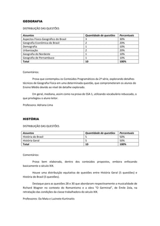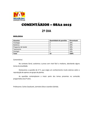 O documento fornece um resumo da distribuição de assuntos e questões nas provas do SSA2 2015 para as disciplinas de Biologia, Química, História, Geografia e Sociologia. A maioria das provas contemplou bem os conteúdos programáticos e teve nível mediano de dificuldade, com exceção de uma questão de Botânica que exigiu conhecimento aprofundado.