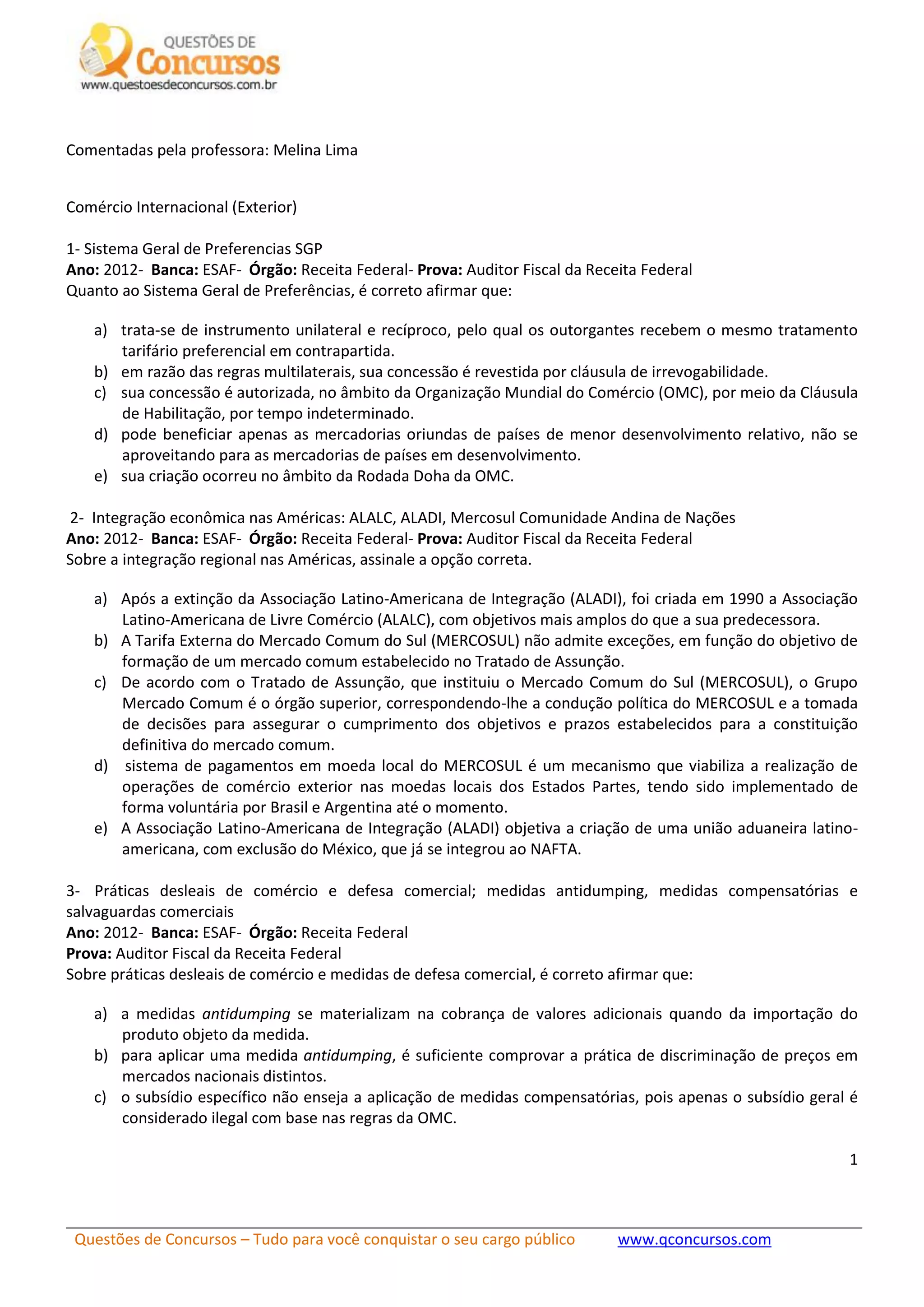 O documento discute questões sobre comércio internacional e legislação aduaneira brasileira. As questões abordam tópicos como o Sistema Geral de Preferências, integração econômica na América Latina, práticas desleais de comércio, instituições relacionadas ao comércio exterior no Brasil, legislação aduaneira e regimes aduaneiros.