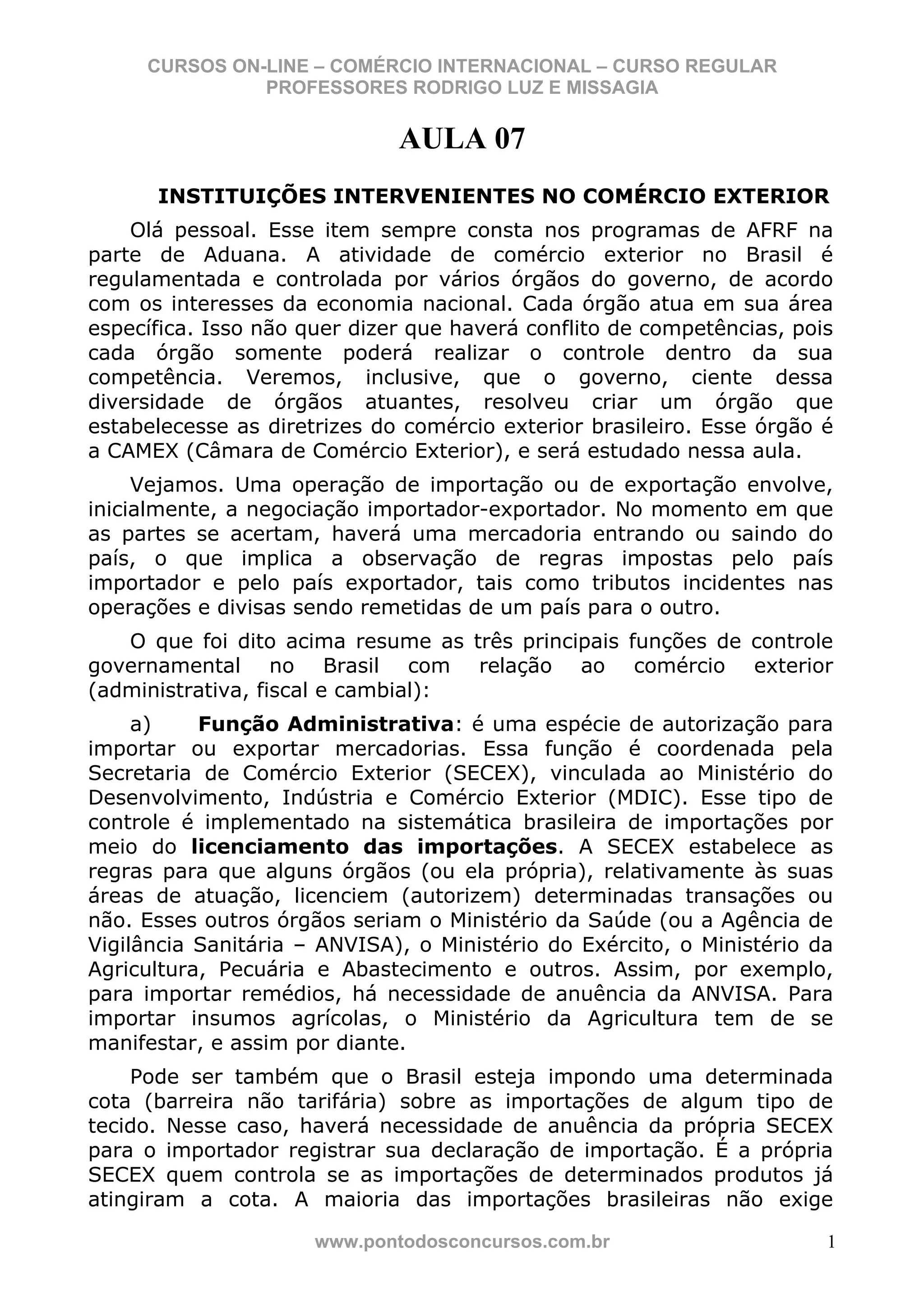 O documento discute as instituições governamentais envolvidas no comércio exterior no Brasil. As principais funções de controle são a administrativa exercida pela Secretaria de Comércio Exterior, a fiscal pela Receita Federal, e a cambial pelo Banco Central. O Sistema Integrado de Comércio Exterior integra as atividades desses órgãos.