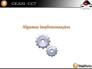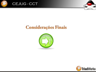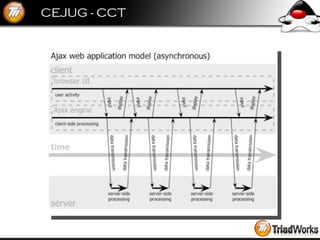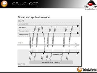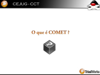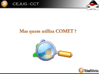 O documento descreve o que é COMET e como ele pode ser usado para fornecer atualizações em tempo real de um servidor para um cliente web mantendo uma conexão persistente. Ele discute como COMET funciona, exemplos de implementação e como frameworks como CometD e DWR facilitam seu uso.