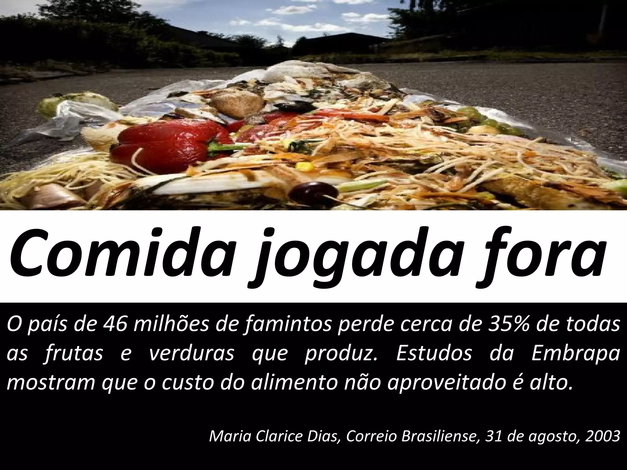 O Brasil desperdiça cerca de 35% dos alimentos que produz, principalmente durante o transporte e manuseio. Estudos mostram que esse desperdício custa bilhões ao país e poderia alimentar milhões de famintas. Além disso, o consumidor acaba pagando o preço do desperdício nos supermercados.