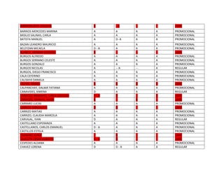 Este documento lista os nomes de alunos com suas notas em quatro trabalhos práticos (TP) e uma observação final. Muitos alunos receberam notas A em todos os TPs e foram promovidos, enquanto outros receberam notas mais baixas e ficaram em exame livre ou regular.