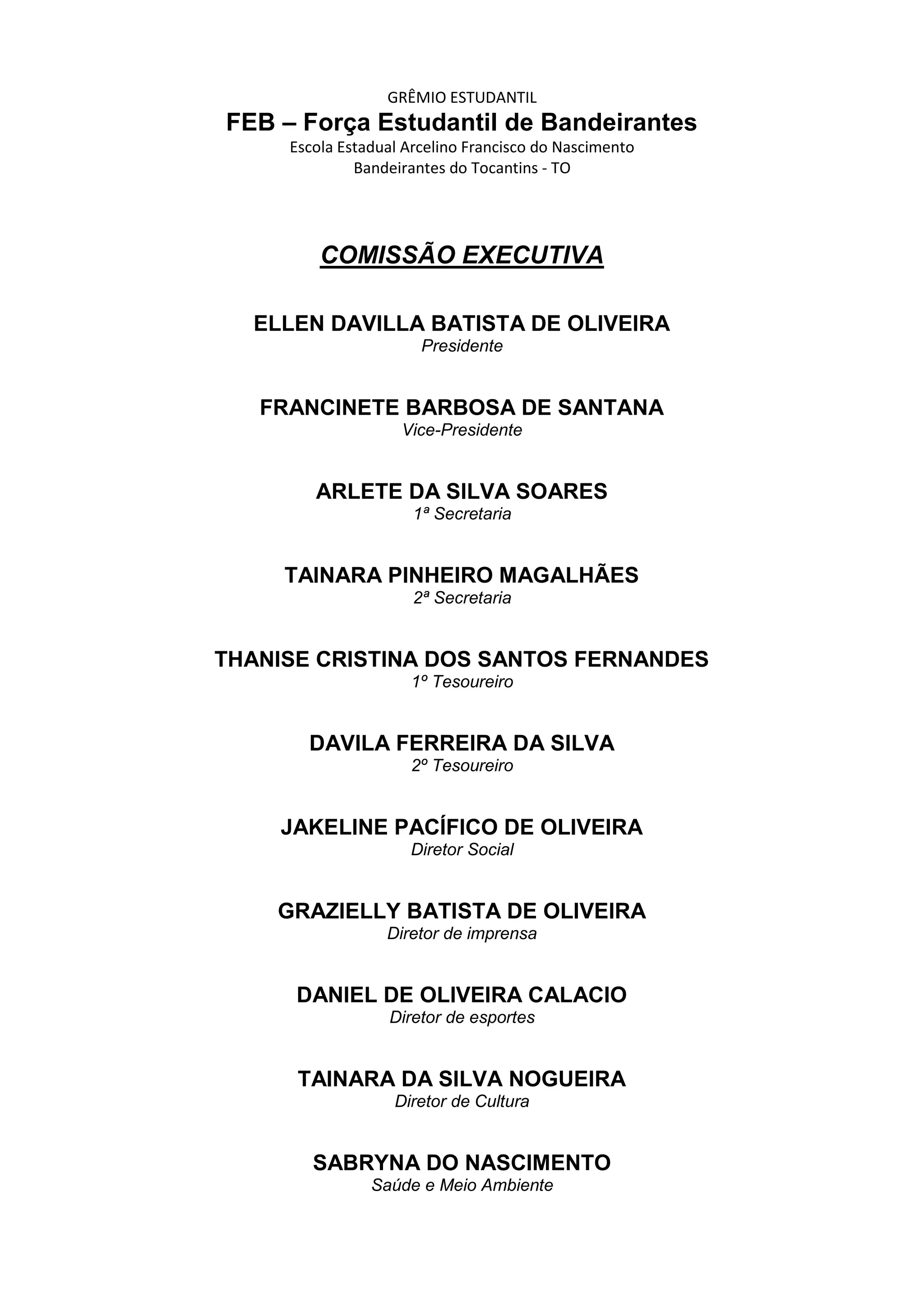 O documento lista a comissão executiva do Grêmio Estudantil da Escola Estadual Arcelino Francisco do Nascimento em Bandeirantes do Tocantins, com Ellen Davilla Batista de Oliveira como Presidente e outros membros nos cargos de Vice-Presidente, Secretários, Tesoureiros e Diretores de áreas como Social, Imprensa, Esportes e Cultura.