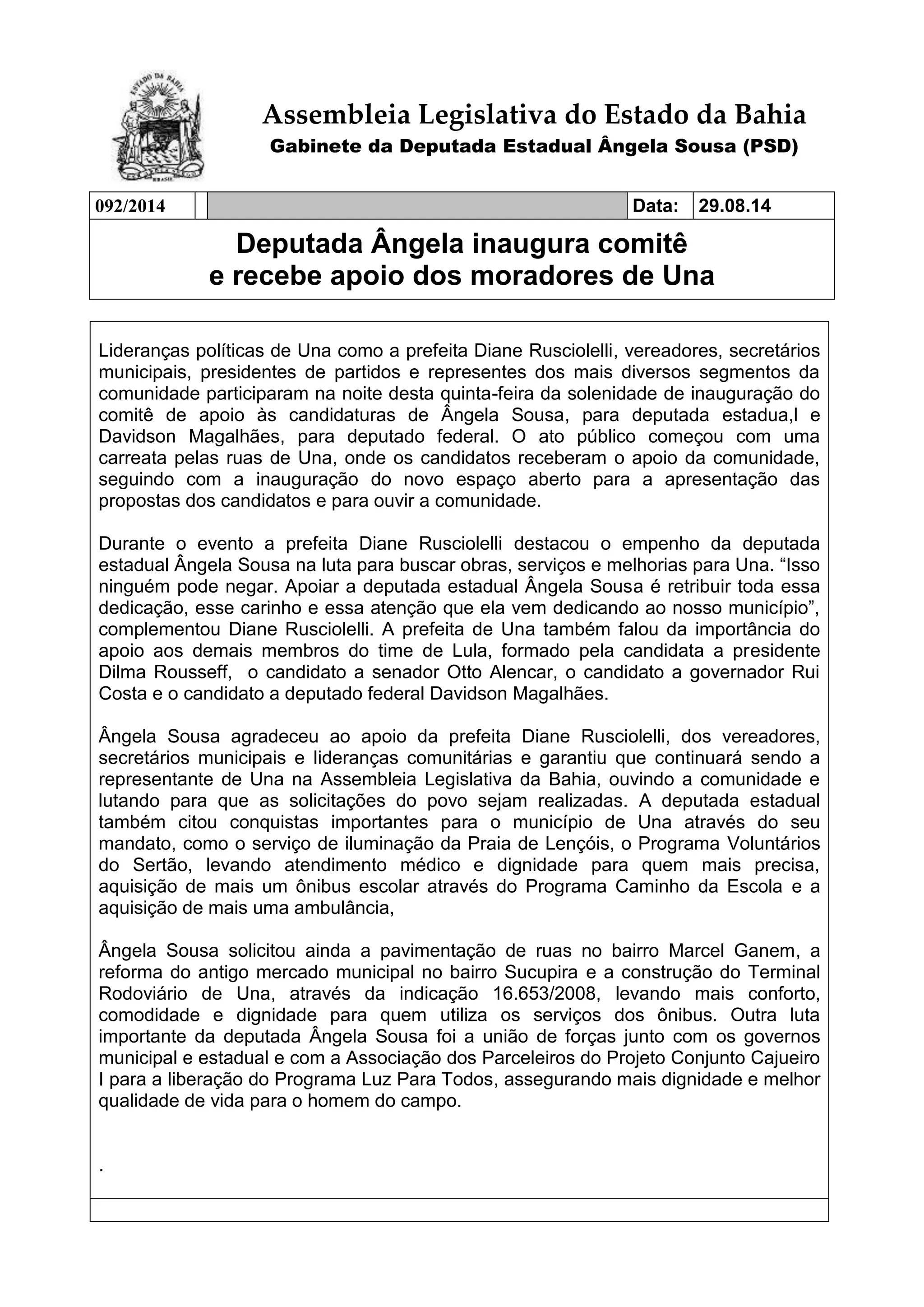 A deputada estadual Ângela Sousa inaugurou seu comitê de apoio em Una e recebeu o apoio da prefeita e da comunidade. A prefeita elogiou o trabalho da deputada em buscar melhorias para o município. Ângela Sousa agradeceu o apoio e prometeu continuar representando Una, citando conquistas como iluminação da praia e aquisição de ônibus e ambulância.