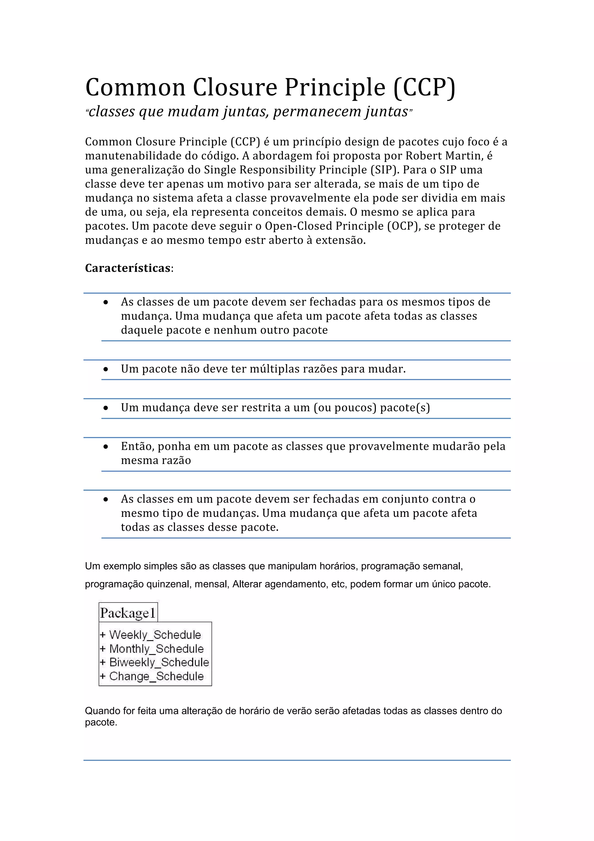 O Common Closure Principle (CCP) propõe que classes que provavelmente mudarão juntas por uma mesma razão devem estar no mesmo pacote, de modo que uma mudança afete todas as classes desse pacote e nenhum outro. O CCP generaliza o Single Responsibility Principle defendendo que classes dependentes permaneçam juntas no código para facilitar a manutenção.