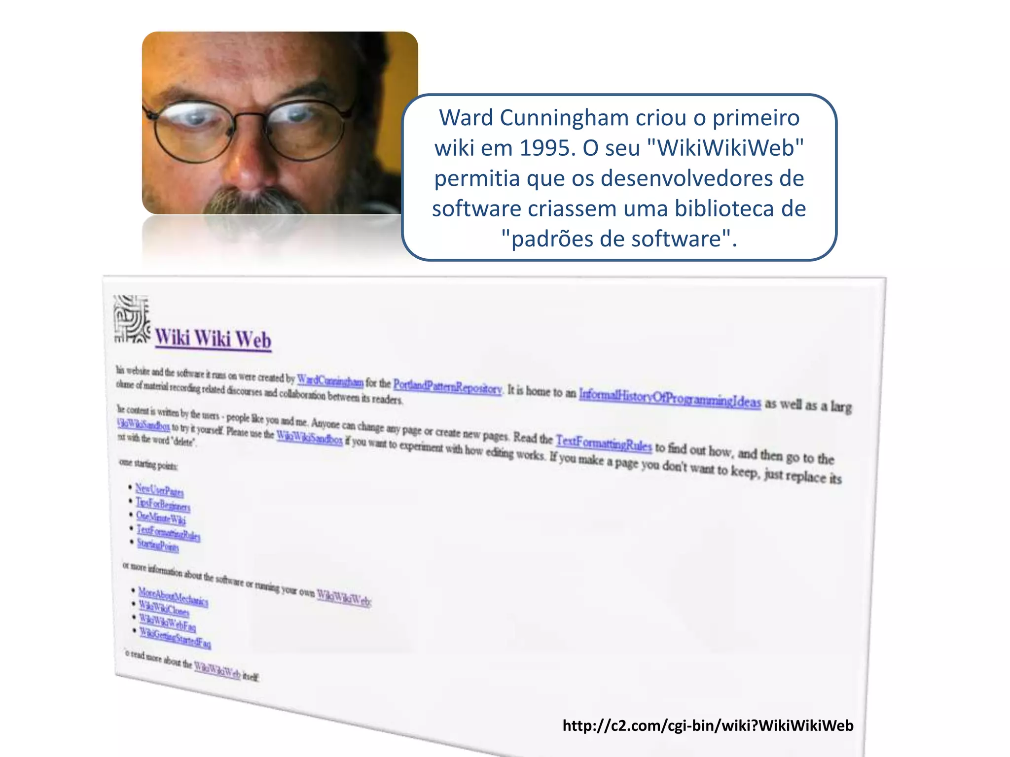 Ward Cunningham criou o primeiro wiki, o "WikiWikiWeb", em 1995, permitindo que desenvolvedores colaborassem na criação de padrões de software. A Wikipédia, fundada em 15 de janeiro de 2001 pela Wikimedia Foundation, é uma enciclopédia online colaborativa que permite que qualquer pessoa edite ou crie artigos, sendo um projeto de conteúdo livre e multilíngue. Várias outras ferramentas wiki, como Wiktionary e Wikispecies, também estão disponíveis para colaboração em diferentes áreas de conhecimento.