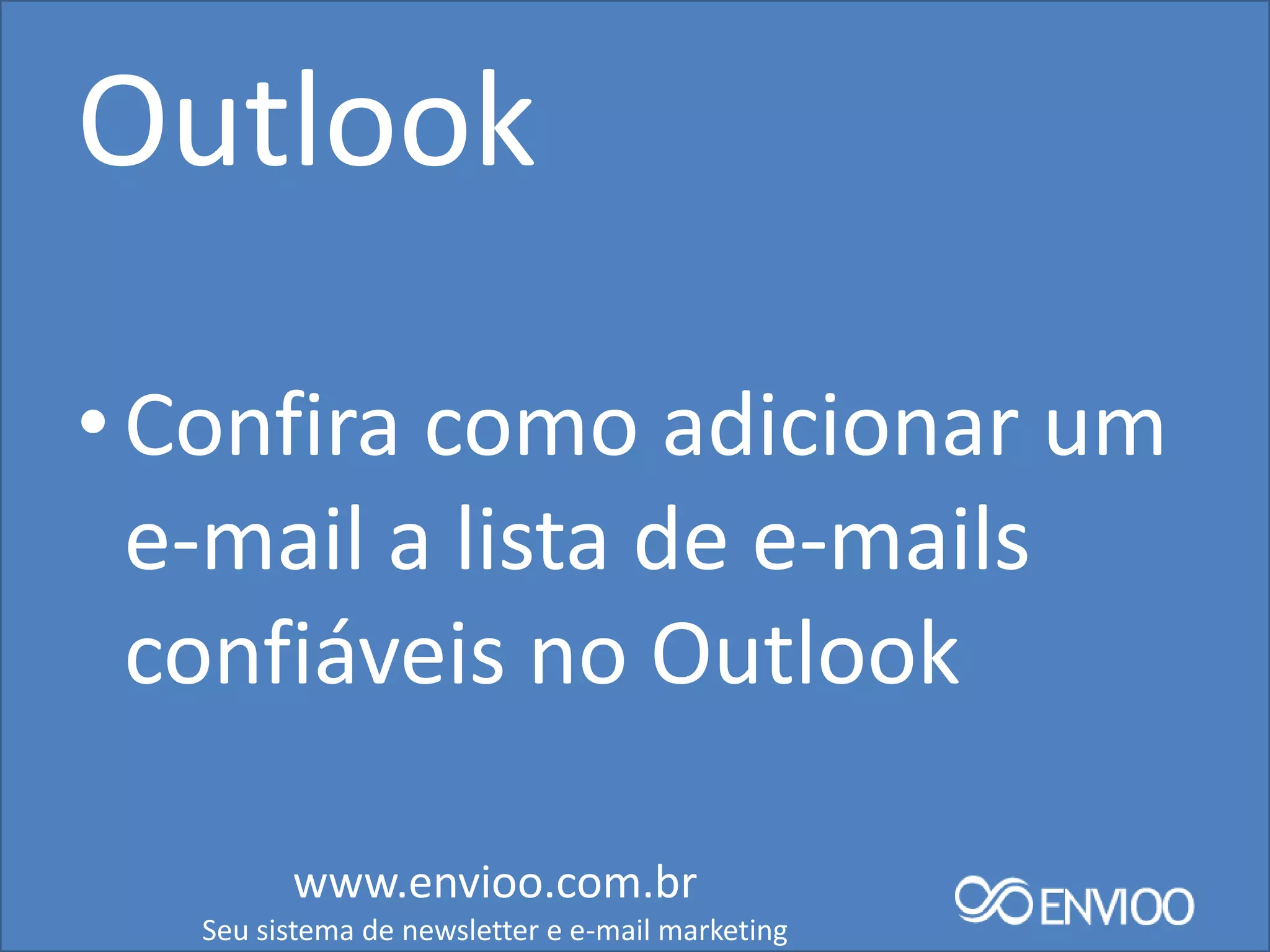 O documento fornece instruções sobre como adicionar endereços de e-mail confiáveis nos sistemas Outlook e Gmail para evitar que e-mails importantes sejam marcados como spam. As etapas para Outlook incluem selecionar a pasta Lixo Eletrônico, marcar o e-mail como não-spam e adicionar o domínio do remetente à lista confiável. Para o Gmail, as etapas são acessar a pasta Spam, marcar o e-mail, clicar em "Não é Spam" e confirmar que o e-