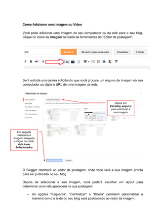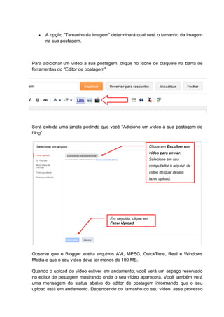 Este documento explica como adicionar imagens e vídeos a um blog no Blogger. Para imagens, clique no ícone de imagem e selecione um arquivo ou URL. Para vídeos, clique no ícone de claquete e faça o upload de um arquivo AVI, MPEG, QuickTime, Real ou Windows Media menor que 100MB. O Blogger exibirá os arquivos selecionados no editor de postagem.