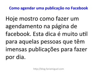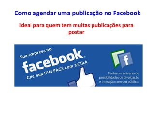 O documento apresenta um guia sobre como agendar publicações no Facebook, especialmente útil para quem possui várias postagens diárias. Destaca a importância de manter uma página ativa e atualizada para atrair visitantes, comparando-a a um blog que precisa de conteúdo novo para ser bem posicionado nos motores de busca. Inclui um link para um vídeo que demonstra o processo de agendamento.
