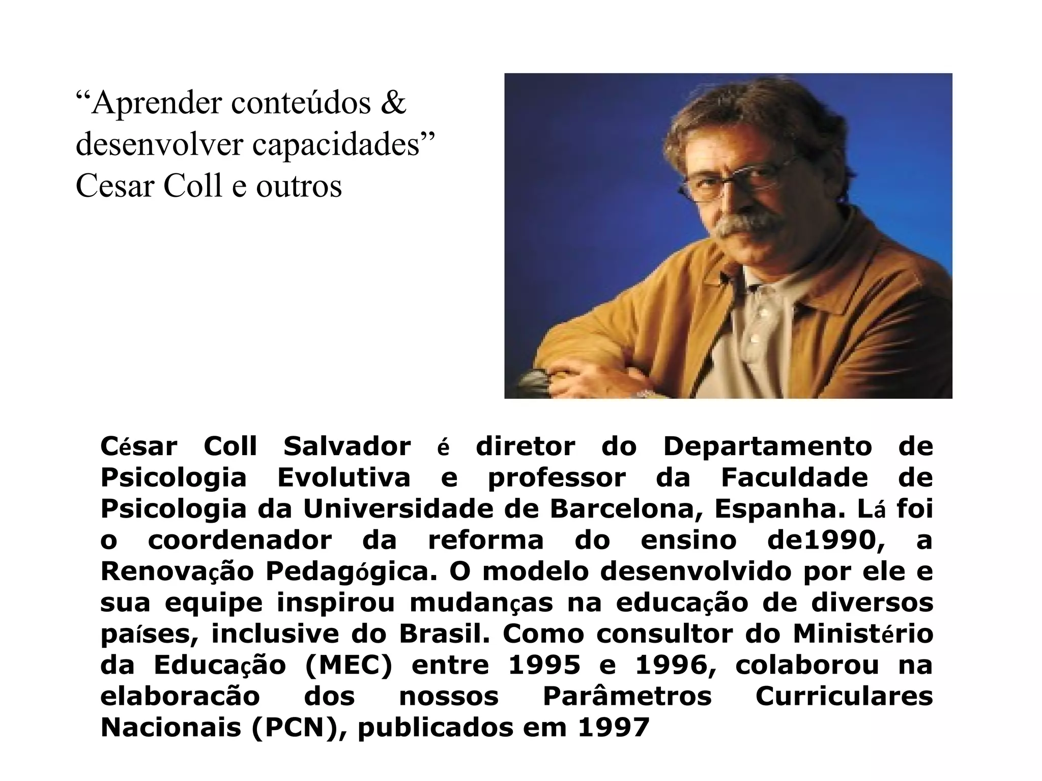 O documento discute a importância de se ensinar diferentes tipos de conteúdos, incluindo conteúdos conceituais, procedimentais e atitudinais. Defende que os conteúdos devem ser organizados de forma equilibrada e significativa para os alunos, levando em conta seus conhecimentos prévios. Também ressalta a necessidade de integrar as diferentes disciplinas, em vez de separá-las, para que os alunos possam compreender a realidade de forma integrada.