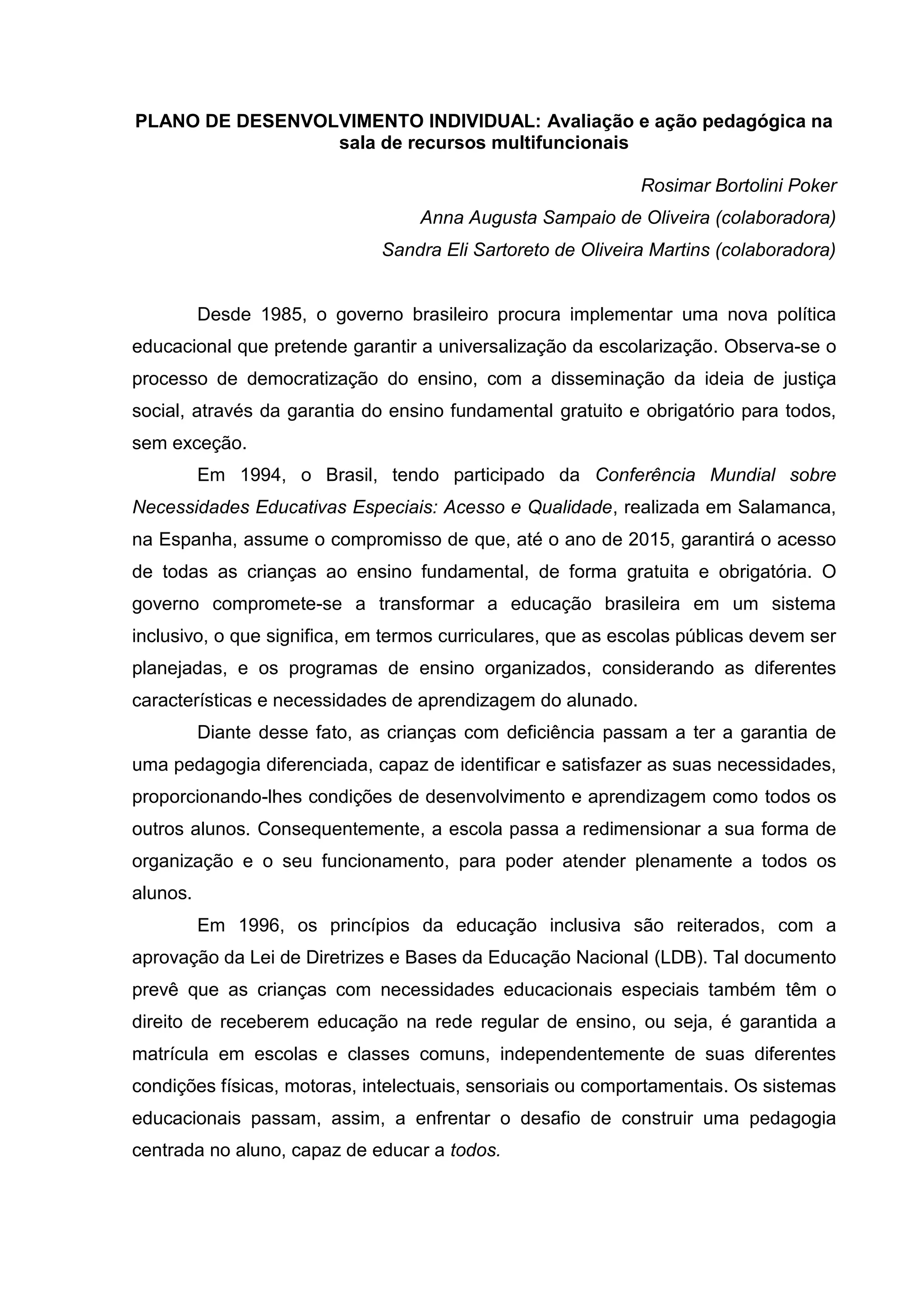O documento discute a educação inclusiva no Brasil e o papel do professor de sala de recursos multifuncionais. Ele descreve como a avaliação dos alunos é fundamental para identificar suas necessidades educacionais especiais e desenvolver planos de desenvolvimento individualizados para apoiar sua aprendizagem. O documento também discute como o currículo, metodologias de ensino e avaliação devem ser adaptados para atender a diversidade de alunos.