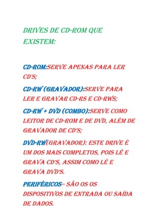 O documento lista os principais componentes de um computador, incluindo o processador, memória RAM, disco rígido e placa-mãe. Ele também descreve diferentes tipos de leitores de CD/DVD e seus usos para ler e gravar CDs e DVDs. Finalmente, define periféricos como dispositivos de entrada/saída e barramento como os fios que permitem a comunicação entre componentes internos.
