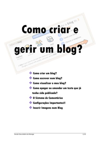 Este documento fornece instruções sobre como criar e gerenciar um blog. Explica como criar um blog no Blogger, escrever posts, visualizar o blog, editar ou apagar posts, configurar comentários e inserir imagens.