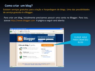 O documento fornece instruções passo a passo para criar um blog gratuitamente usando o serviço Blogger: 1) Crie uma conta no Blogger inserindo seu email e senha; 2) Escolha um nome e endereço para o blog; 3) Selecione um modelo; 4) Comece a postar conteúdo no blog.