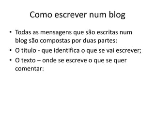 Para criar um blog, o primeiro passo é aceder ao site www.blogger.pt e criar uma conta, escolhendo um nome de utilizador, password e email. Depois, preenche-se os campos de identificação do blog e clica-se em finalizar para criá-lo.