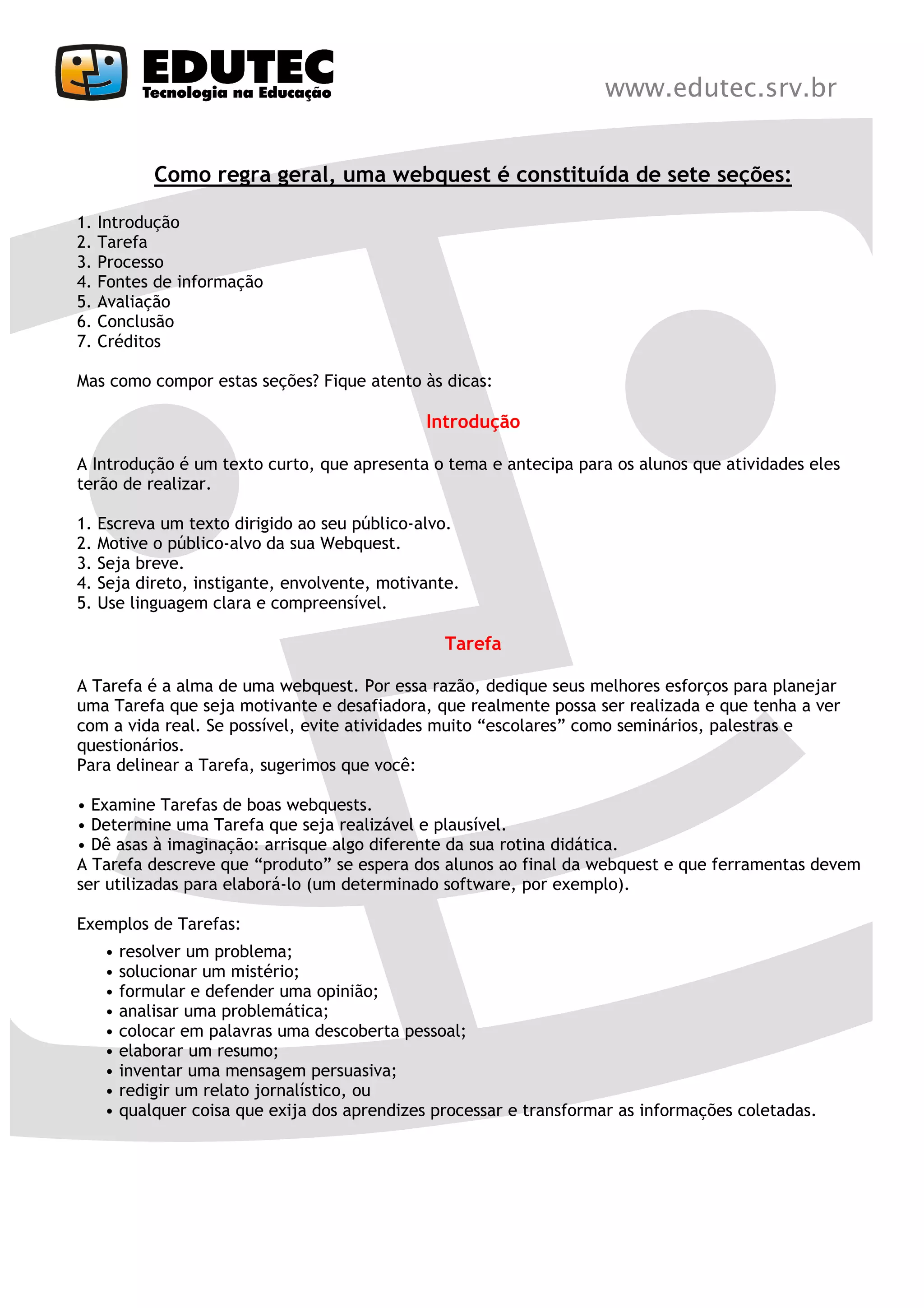 O documento fornece diretrizes para criar uma webquest bem-sucedida, incluindo seções como introdução, tarefa, processo, recursos, avaliação e conclusão. A tarefa deve ser motivadora e envolver a resolução de um problema ou mistério. O processo deve detalhar os passos a serem seguidos. Os recursos devem incluir fontes de informação relevantes.