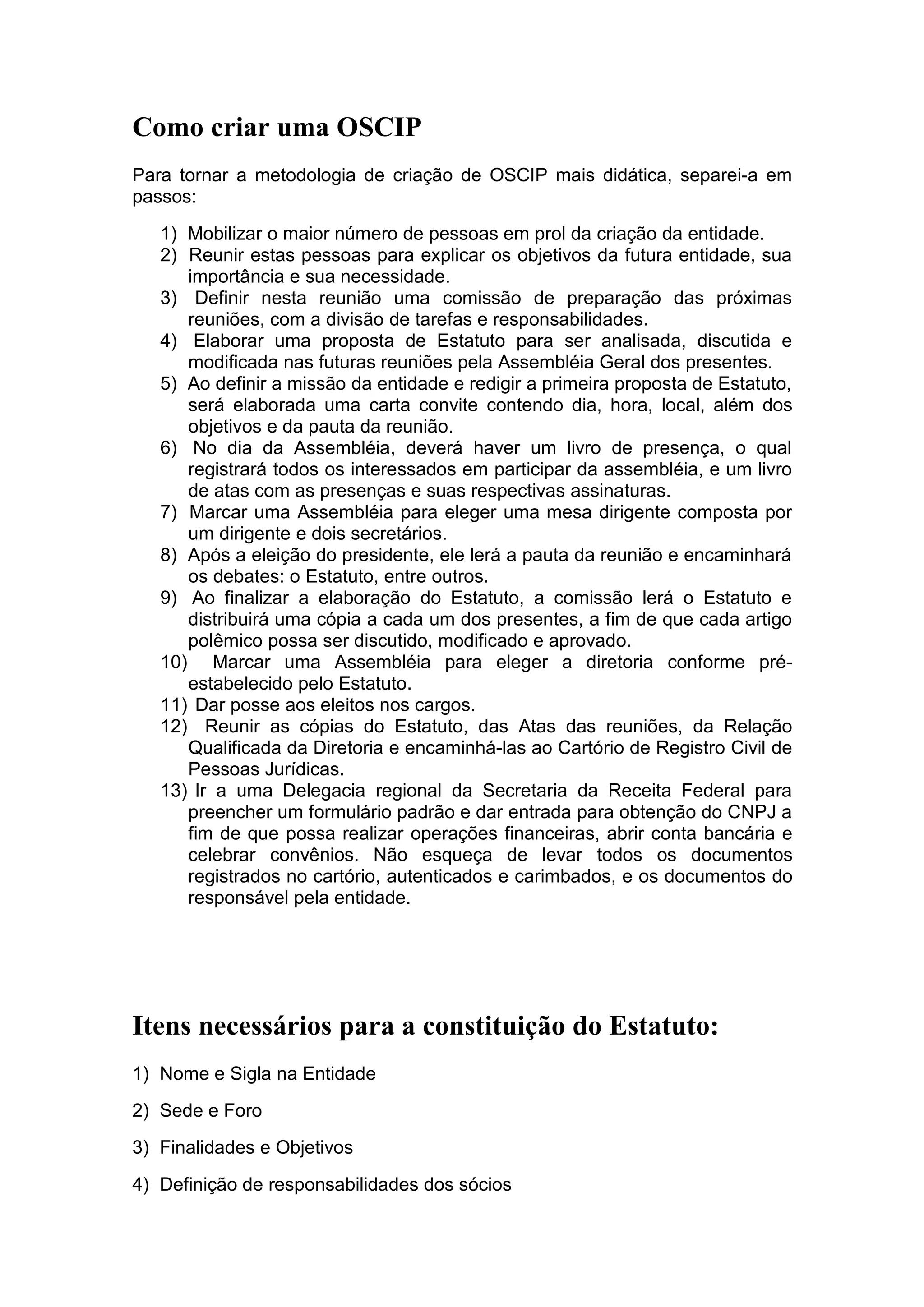 O documento fornece instruções detalhadas sobre como criar uma Organização da Sociedade Civil de Interesse Público (OSCIP) em 13 passos, incluindo reunir pessoas interessadas, elaborar estatutos, realizar assembleias gerais, registrar a organização no cartório e órgãos governamentais para obter o CNPJ. Também discute objetivos comuns e como definir objetivos focados para atrair financiamento.