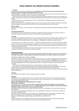 Este documento fornece instruções sobre como elaborar um relatório técnico-científico, incluindo seções para introdução, material utilizado, procedimento experimental, resultados, discussão dos resultados, conclusão e bibliografia.