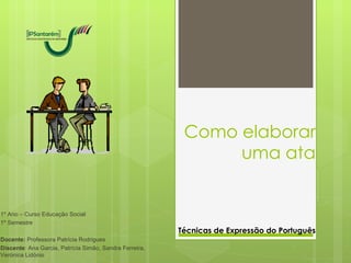 O documento explica como elaborar uma ata, definindo-a como um registro escrito de fatos e decisões de uma reunião. Ele detalha as regras para a elaboração, incluindo relatar os assuntos pela ordem abordada e usar linguagem concisa e objetiva, e a estrutura padrão de uma ata com título, local, data e assuntos discutidos.