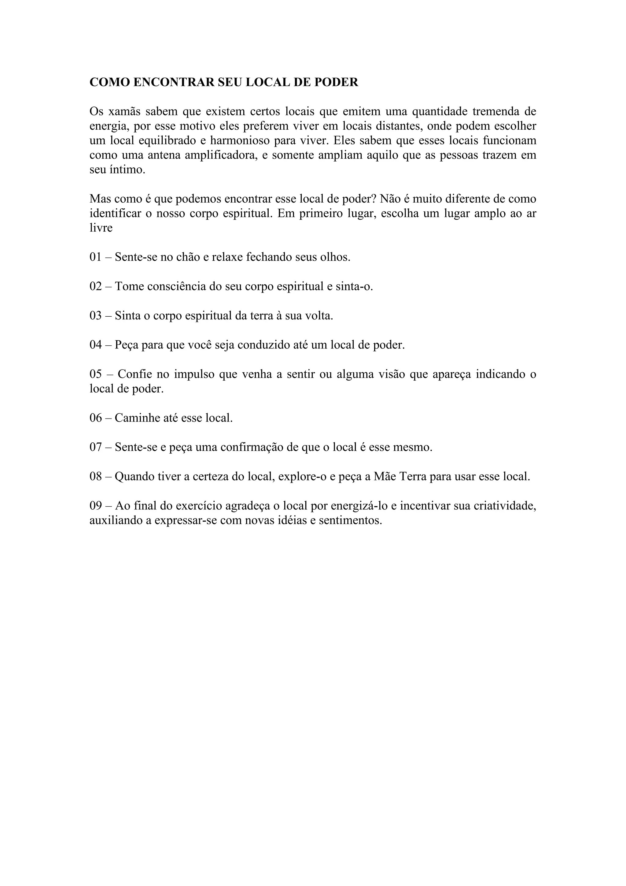 Os xamãs vivem em locais de grande energia que amplificam a energia das pessoas. Para encontrar seu próprio local de poder, relaxe e peça orientação, então confie em qualquer visão ou impulso para caminhar até o local, sentir sua energia, e pedir permissão para usá-lo.