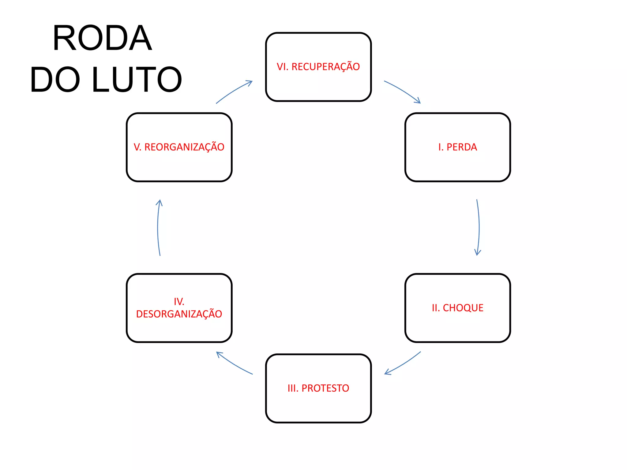 O documento descreve as etapas da roda do luto: I) Perda, II) Choque, III) Protesto, IV) Desorganização e V) Reorganização. Cada etapa envolve sentimentos e sintomas específicos como negação, raiva, depressão e retirada social na tentativa de lidar e se adaptar à perda sofrida. A roda gira até que a pessoa complete o processo de luto e esteja pronta para seguir em frente.
