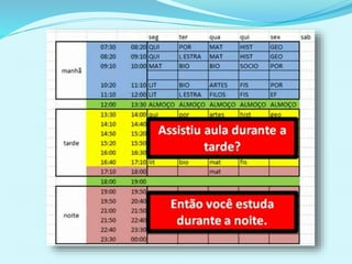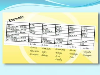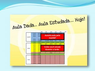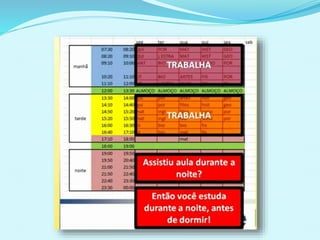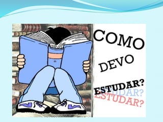 O documento discute estratégias para estudar de forma eficaz, como organizar o tempo, estabelecer prioridades e criar um horário de estudos. Também fornece dicas sobre como escolher um local adequado para estudar, a importância de uma alimentação saudável e da prática de exercícios físicos para melhorar o desempenho nos estudos.