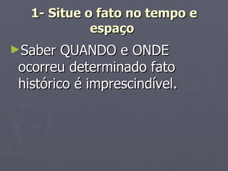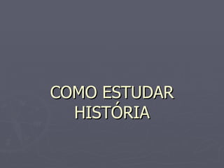 O documento fornece 10 dicas para estudar história de forma efetiva, incluindo situar os fatos no tempo e espaço, analisar o contexto histórico e antecedentes, compreender o fato e seus desdobramentos, não deixar o estudo para a última hora, estudar em grupo e falando em voz alta, anotar durante as aulas, treinar respostas para provas, encontrar o próprio ritmo de estudo e apreciar os resultados obtidos.