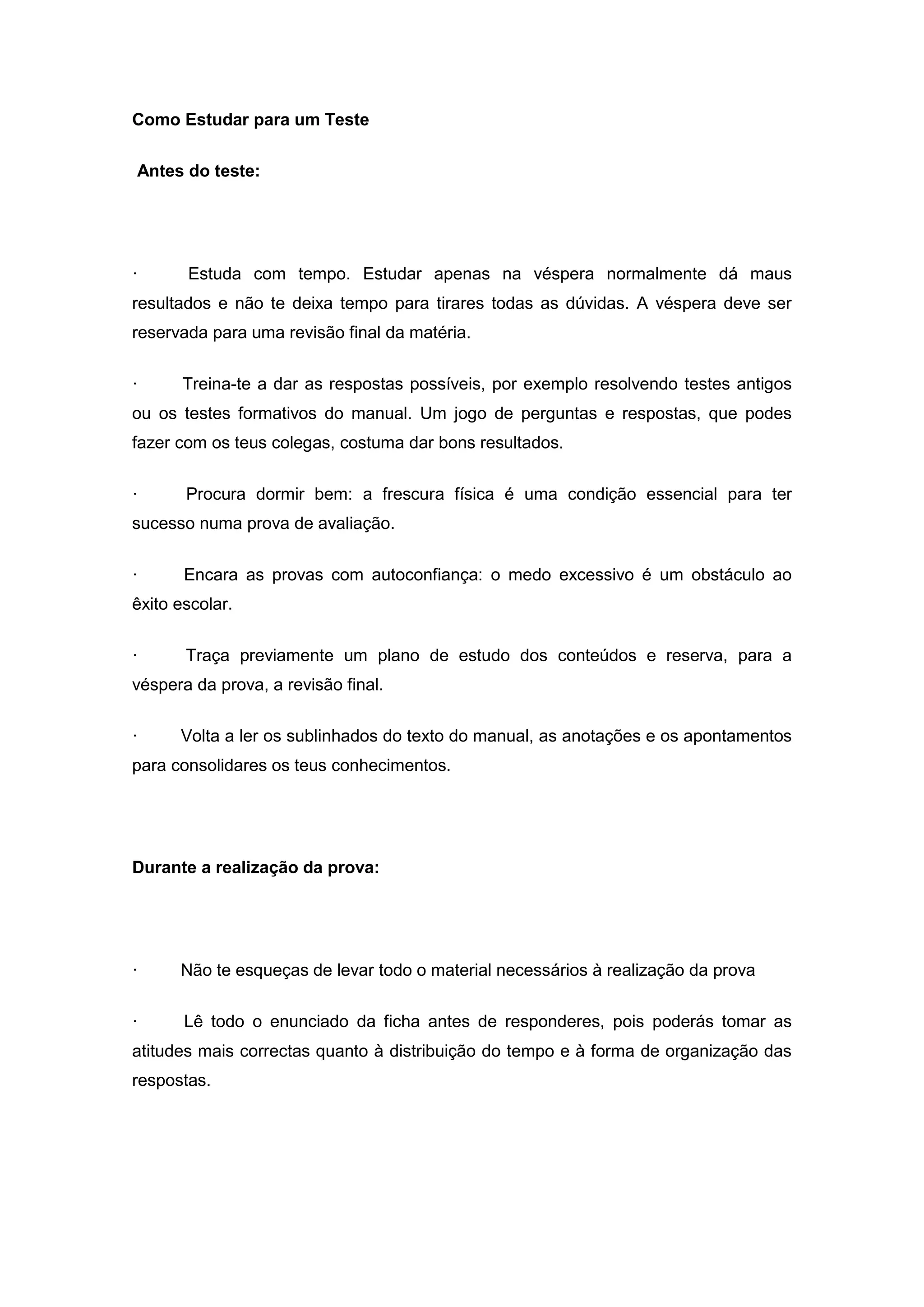 O documento fornece dicas sobre como estudar para um teste, incluindo estudar com antecedência em vez de deixar para a véspera, praticar resolvendo testes antigos, dormir bem, ter autoconfiança, ler cuidadosamente os enunciados, distribuir o tempo de forma estratégica, solicitar feedback do professor, e continuar estudando independentemente dos resultados.