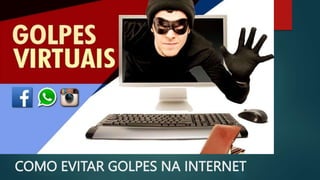 O documento lista os golpes financeiros mais comuns na internet, incluindo golpes de Pix, empréstimos, falsos sequestros, restituição de imposto de renda, maquininhas de cartão quebradas, falsas centrais de atendimento, boletos falsos, motoboys falsos, pirâmides financeiras, links falsos, leilões falsos, contas laranjas, golpes do INSS e empregos. Ele fornece dicas para evitar cair nesses golpes.