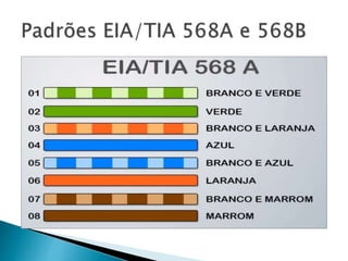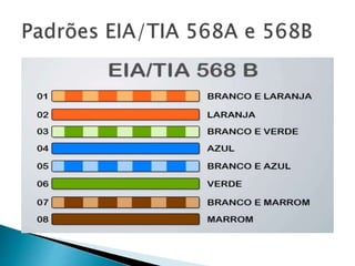 O documento discute equipamentos e consumíveis de rede, limites de comprimento de cabo Ethernet, padrões EIA/TIA 568A e 568B para sequência de cores dos fios internos do cabo, e as etapas para crimpar corretamente um conector RJ45 em um cabo de rede.