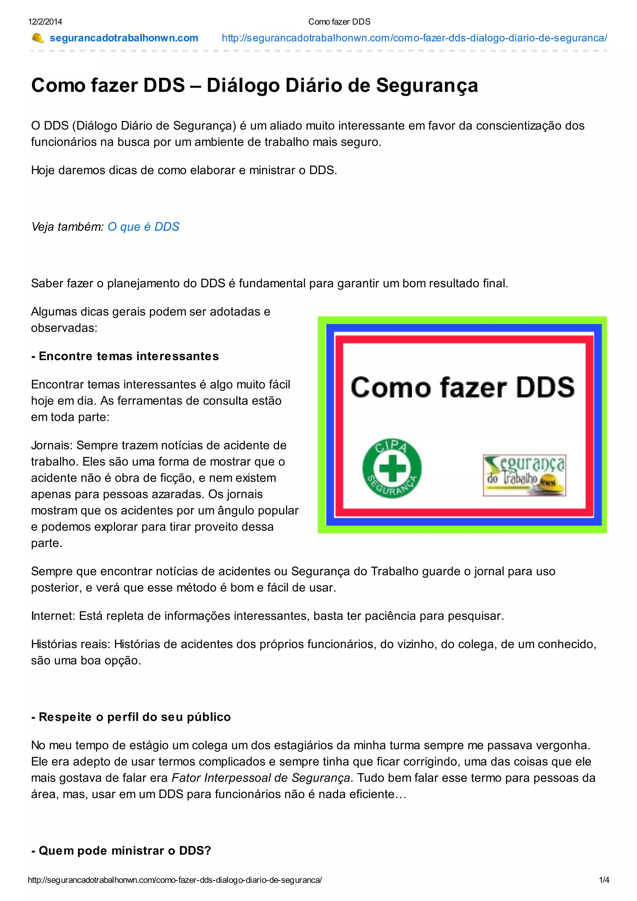 O documento fornece dicas para elaborar e ministrar o DDS (Diálogo Diário de Segurança), incluindo encontrar temas interessantes a partir de jornais, internet e histórias reais; respeitar o perfil do público; e adotar uma postura profissional durante a apresentação.