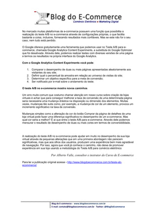 O documento discute como realizar Teste A/B no e-commerce para melhorar o desempenho da loja virtual. O Teste A/B compara versões diferentes de elementos da página para determinar qual gera mais conversões. Fazendo testes regulares com pequenas alterações, é possível otimizar a experiência do usuário e aumentar as vendas.