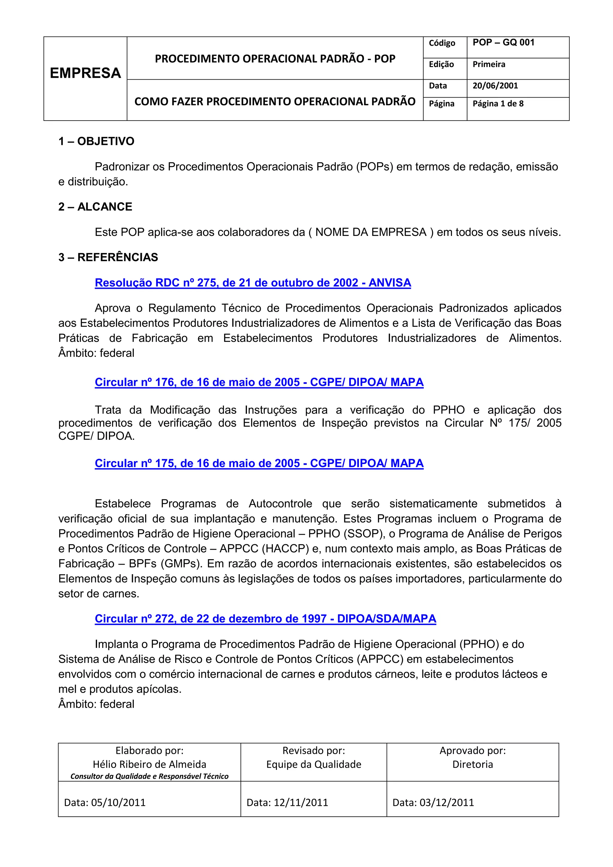 Este documento descreve os procedimentos para criação e controle de Procedimentos Operacionais Padrão (POPs) em uma empresa. Ele define POPs como documentos que descrevem rotinas de trabalho e estabelece diretrizes para redação, aprovação, distribuição e atualização de POPs.
