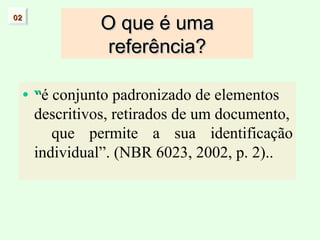 Este documento fornece instruções sobre como fazer referências bibliográficas em documentos acadêmicos de acordo com as normas da ABNT. Ele explica o que é uma referência, como ordená-las e onde localizá-las. Além disso, fornece exemplos de como referenciar diferentes tipos de fontes como livros, artigos e documentos de autoria coletiva.