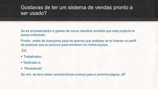 O documento apresenta uma proposta para empreendedores interessados em criar um sistema de vendas automatizado. Destaca a importância de características como trabalho, dedicação e persistência para integrar a equipe. Os leitores são convidados a assistir a um vídeo e visitar um link para mais informações.