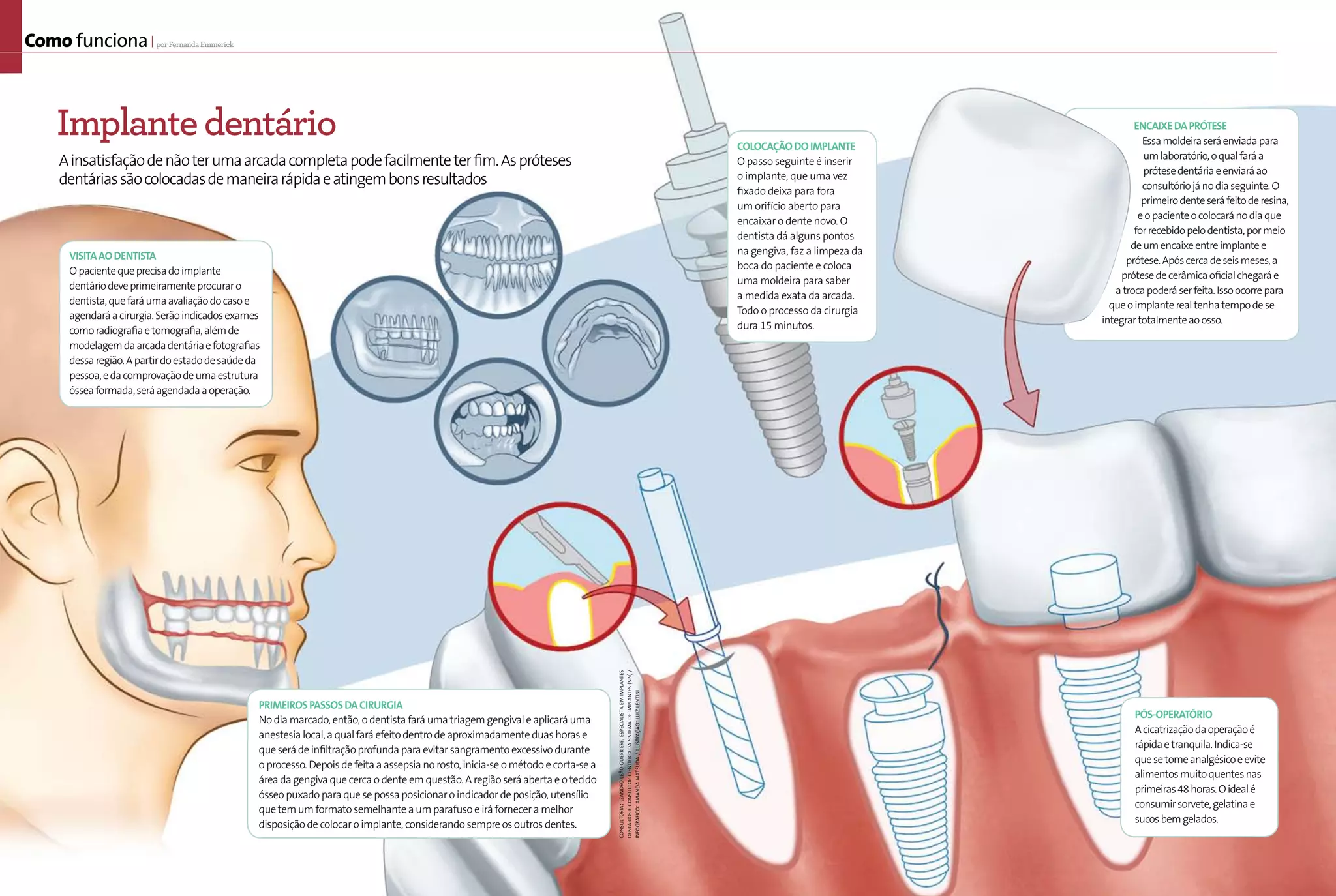 O documento descreve o processo de implante dentário em 3 etapas: 1) uma visita ao dentista para avaliação e agendamento da cirurgia, 2) a cirurgia onde o implante é inserido no osso da mandíbula ou maxilar, e 3) o encaixe da prótese dentária no implante algumas semanas depois quando o implante estiver totalmente integrado ao osso.