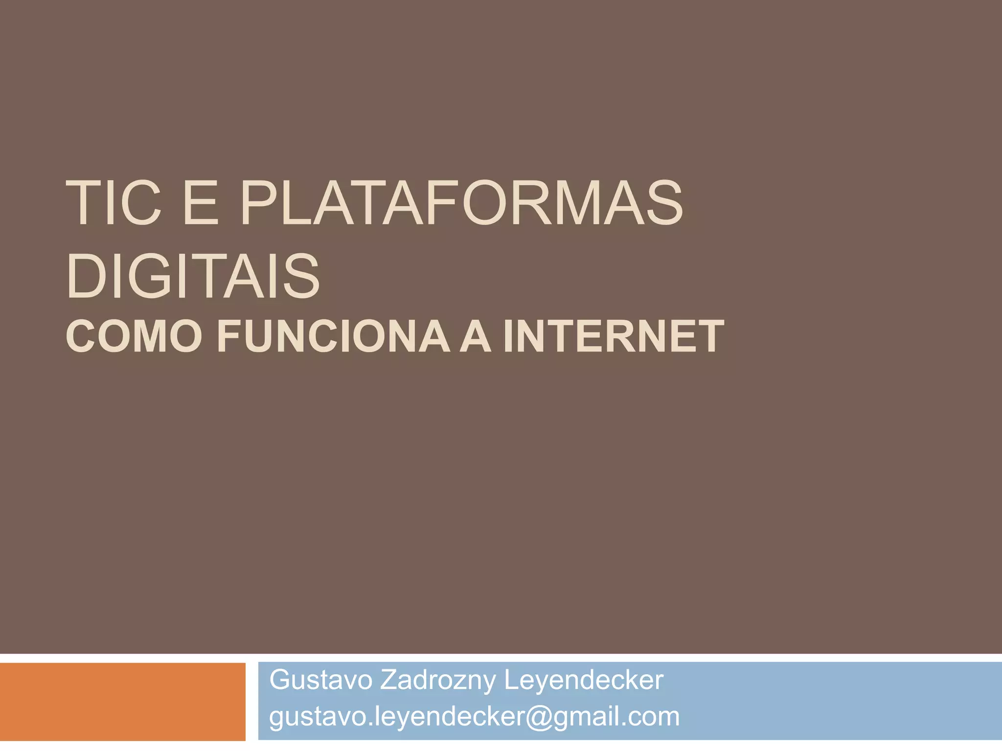 O documento apresenta uma visão geral sobre como funciona a internet, detalhando os protocolos TCP/IP e HTTP, bem como a estrutura de HTML e suas meta tags. Aborda também a governança da internet, incluindo a distribuição de endereços e gestão de domínios. Além disso, menciona tecnologias relacionadas, como JavaScript e frameworks de programação web.