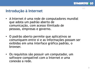 O documento fornece uma introdução abrangente sobre como funciona a Internet. Ele explica que a Internet é uma rede global de computadores que usa padrões abertos de comunicação. Também descreve brevemente a história da Internet e como ela foi desenvolvida inicialmente para fins militares dos EUA.