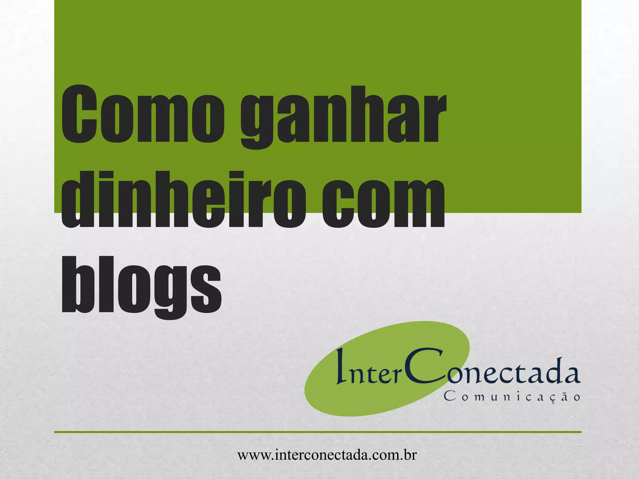 O documento explica três maneiras de ganhar dinheiro com blogs: anúncios do Google AdSense, programas de afiliados e publicidade direta. Também enfatiza a importância de ter um alto volume de acessos ao blog para ser lucrativo por meio destas opções de monetização.