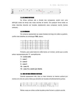 O documento explica os conceitos básicos de como ler e entender tablaturas para violão ou guitarra. A tablatura representa as cordas do instrumento de cabeça para baixo e usa números para indicar os trastes. Os números na tablatura indicam qual corda e traste devem ser pressionados, enquanto símbolos especiais indicam técnicas como slides e hammer-ons.