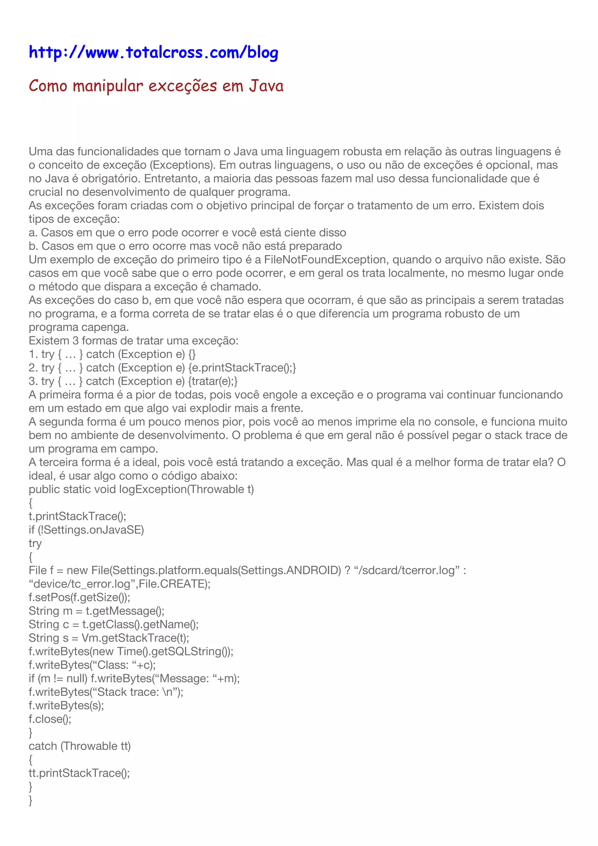 1) O documento discute como manipular exceções corretamente em Java para tornar programas mais robustos. 2) Existem dois tipos de exceções: aquelas esperadas e tratadas localmente e aquelas inesperadas que devem ser tratadas globalmente. 3) A melhor prática é tratar exceções inesperadas imprimindo a pilha de chamadas e salvando em log, e "disparar" a exceção para cima até onde não for mais possível tratar.