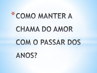 O documento fornece 20 dicas para manter o amor vivo em um relacionamento ao longo dos anos. Algumas dicas incluem: colocar o parceiro em primeiro lugar, ser amigos um do outro, resolver conflitos antes de dormir, e amar o outro incondicionalmente. O texto argumenta que o amor verdadeiro é querer a felicidade do outro acima da própria.
