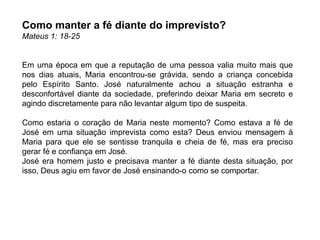 O documento descreve como José manteve a fé diante da situação imprevista de Maria estar grávida do Espírito Santo. Ele não se precipitou, considerou os sonhos de Deus, e não temeu o inesperado, agindo pela direção de Deus.
