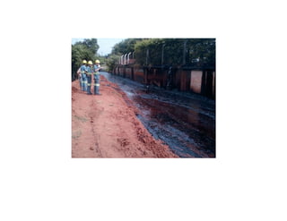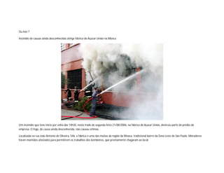 Três incidentes envolvendo incêndios em fábricas e armazéns de açúcar são descritos: 1) Um incêndio de causas desconhecidas em uma fábrica de açúcar em São Paulo em 2006. 2) Um incêndio em armazéns de açúcar no Porto de Santos em 2013. 3) Um incêndio em depósitos de açúcar em Santa Adélia, SP em 2013, que liberou 200-300 toneladas de açúcar derretido para um rio, matando peixes