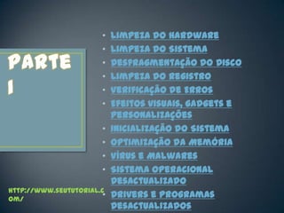 O documento fornece instruções para melhorar o desempenho do computador, incluindo limpar hardware e sistema, desfragmentar o disco, limpar o registro, verificar erros, otimizar memória, e manter antivírus e programas atualizados.