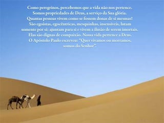 Como peregrinos, percebemos que a vida não nos pertence. Somos propriedades de Deus, a serviço da Sua glória. Quantas pessoas vivem como se fossem donas de si mesmas! São egoístas, egocêntricas, mesquinhas, insensíveis, lutam somente por si; ajuntam para si e vivem a ilusão de serem imortais. Elas são dignas de compaixão. Nossa vida pertence a Deus. O Apóstolo Paulo escreveu: “Quer vivamos ou morramos, somos do Senhor”.