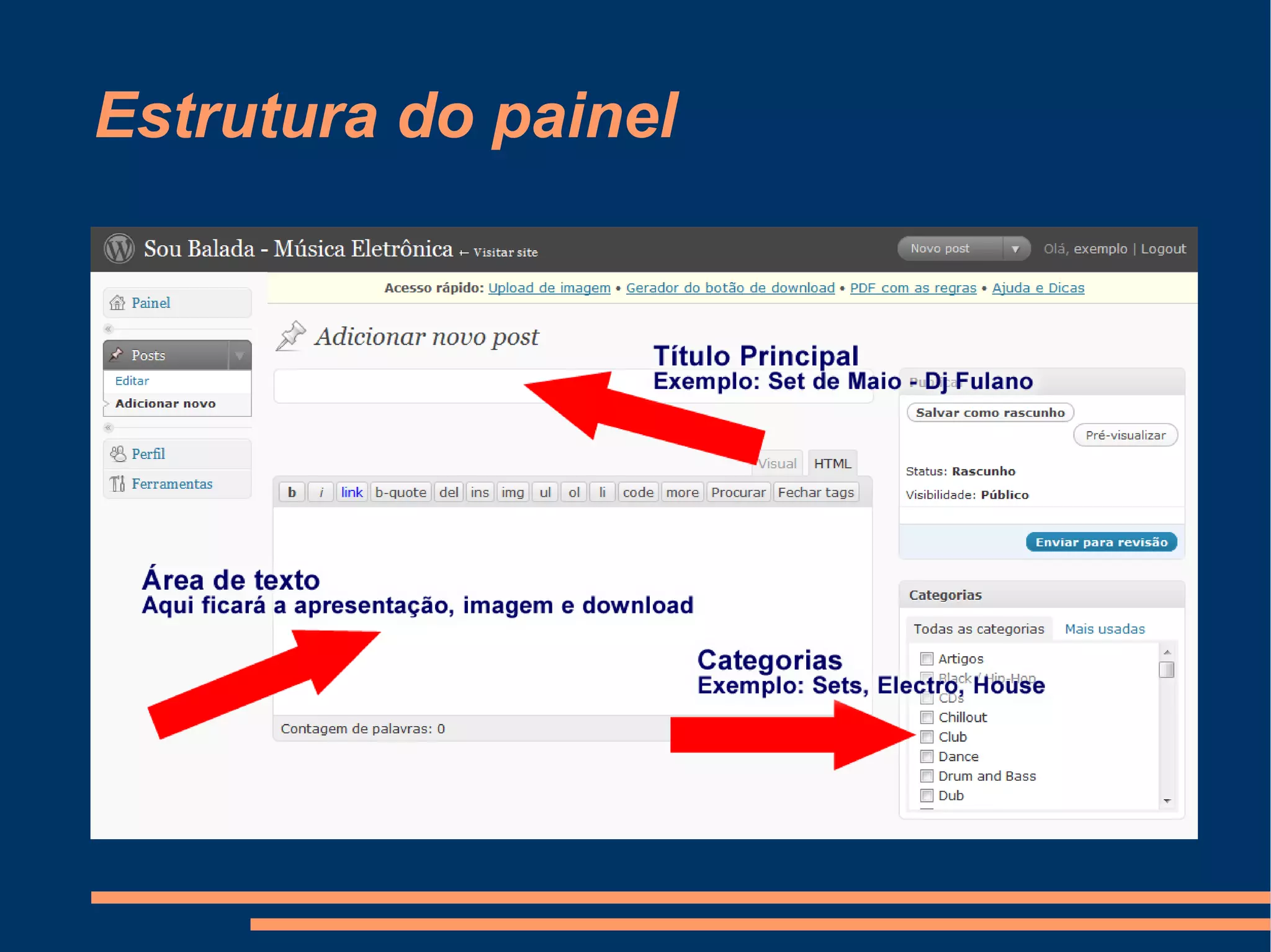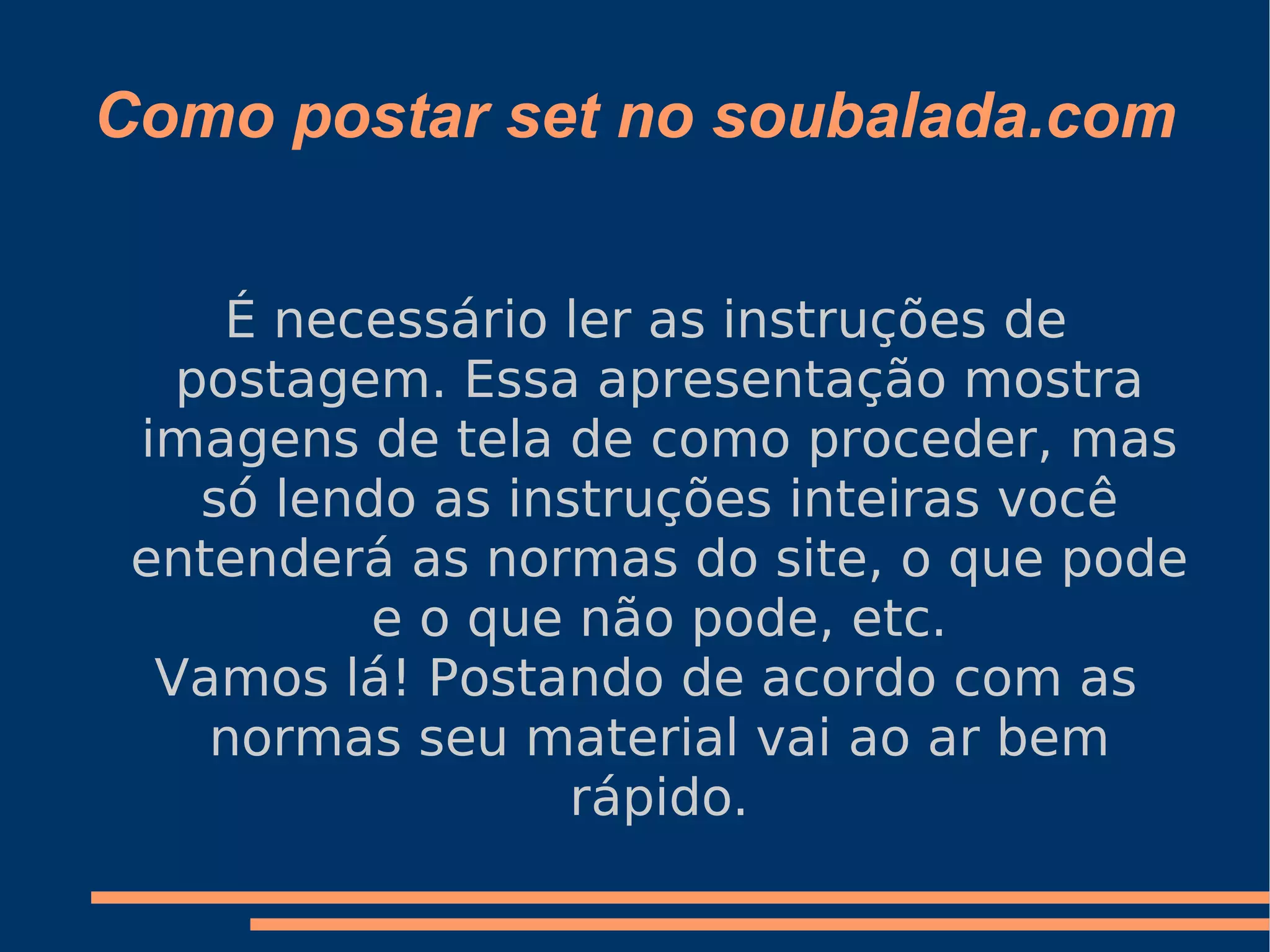 O documento fornece instruções sobre como postar sets no site soubalada.com, explicando os passos para preencher o título, texto e categorias; enviar o material para moderação, que leva de algumas horas a 3 dias para ser aprovado; e opcionalmente adicionar imagens seguindo as normas do site.