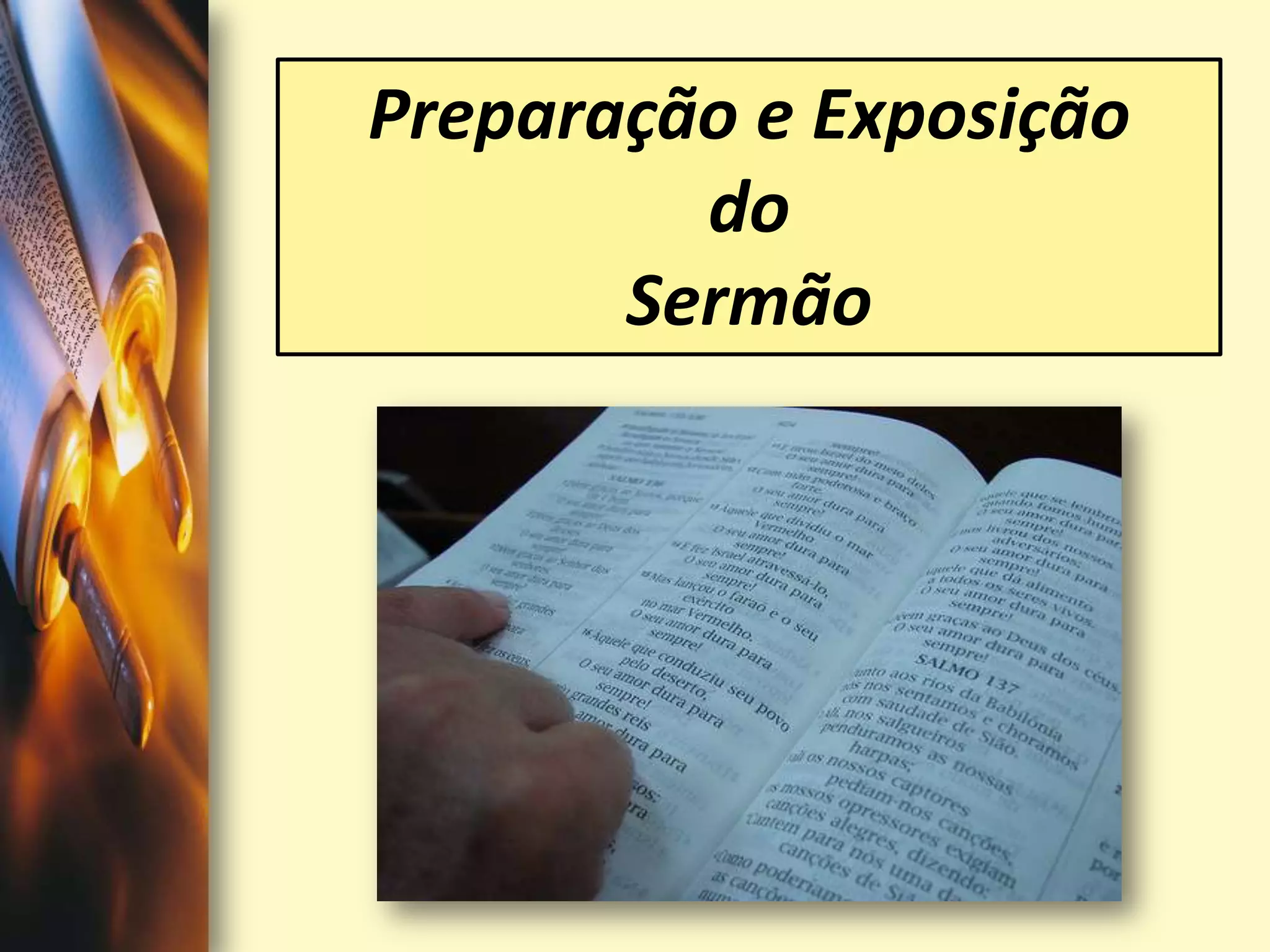 O documento discute a preparação e exposição de sermões. Apresenta diferentes etapas para a elaboração de um sermão, incluindo a análise do contexto bíblico, determinação do tema e estruturação das ideias. Também reflete sobre a importância da preparação espiritual e intelectual do pregador para comunicar eficazmente a mensagem.