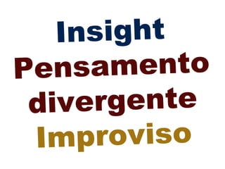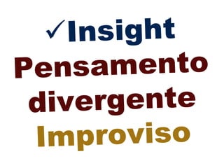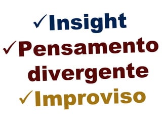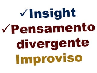 O documento discute a importância da criatividade e como estimular o pensamento criativo. Ele sugere que manter a mente aberta a associações improváveis e respostas não convencionais pode ajudar a gerar mais ideias. Também enfatiza que relaxar certas áreas do cérebro ligadas à consciência e tomada de decisões pode permitir que o improviso ocorra e estimular a criatividade.