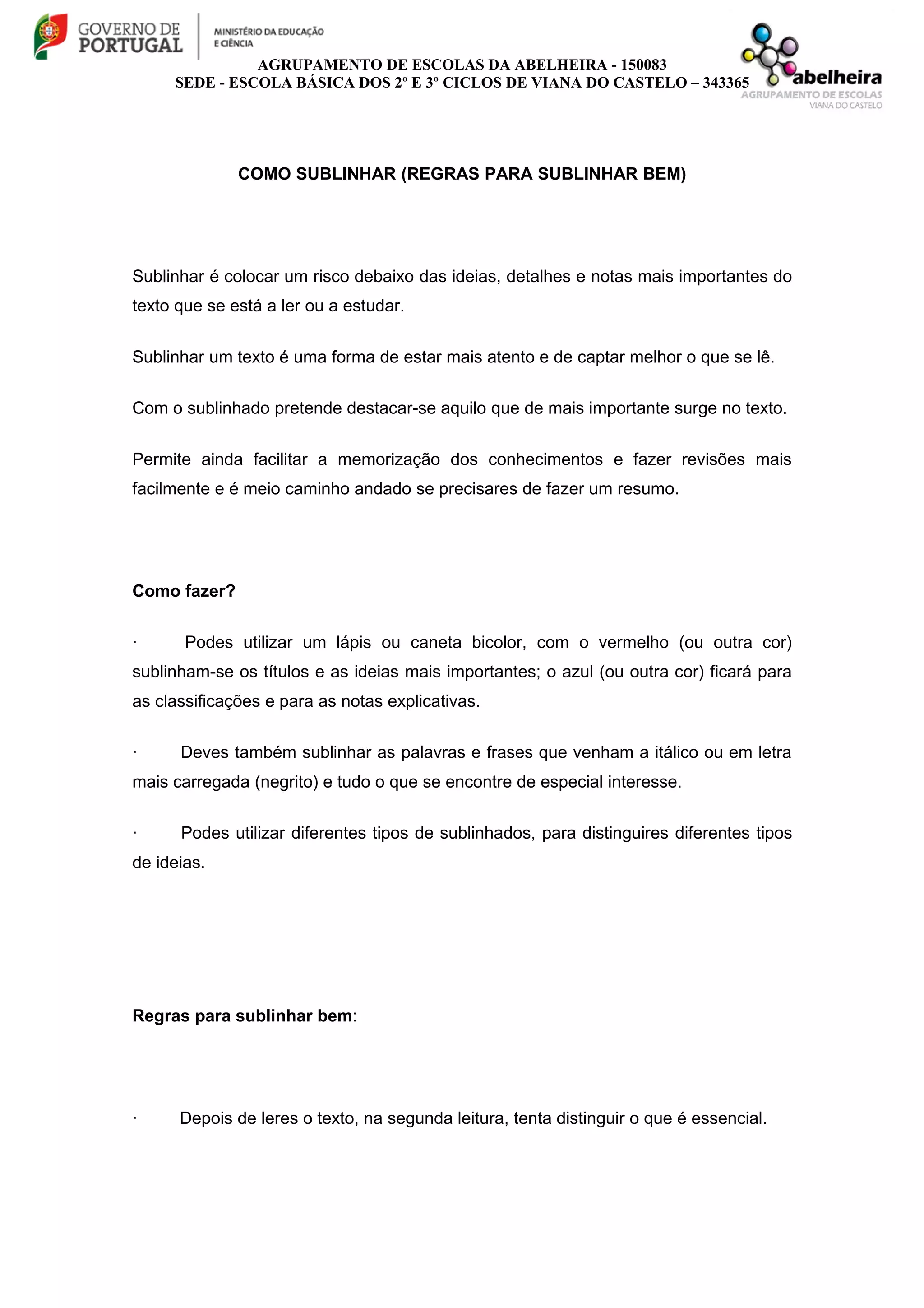 O documento fornece instruções sobre como sublinhar textos de forma eficaz para reter as informações essenciais. Ele recomenda sublinhar ideias e detalhes importantes, distinguindo-os por cores ou estilos de sublinhado. Também sugere não sublinhar tudo para não perder o foco, e fazer notas à margem para destacar pontos como definições, concordâncias e dúvidas.